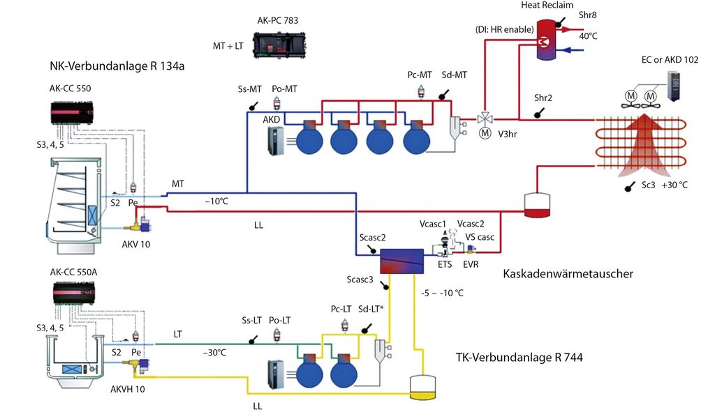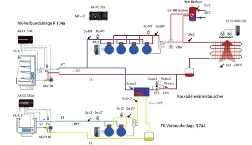 Der Kaskadenregler AK-PC 783 ist speziell für die Regelung von zwei Verdichtergruppen ausgelegt, die durch einen Kaskadenwärmeübertrager zusammengeschaltet werden. Die Tiefkühlung darf nur anlaufen, wenn die Normalkühlung schon in Betrieb ist. Es wird also eine Start-/Stopp-Logik benötigt, die alle Regler zum richtigen Zeitpunkt schaltet. Die Start-/Stopp-Koordination der Verdichtergruppen mit der Freigabe der Einspritzfunktion in den Wärmeübertrager ist intern im Regler implementiert, eine externe Verdrahtung ist also nicht notwendig.