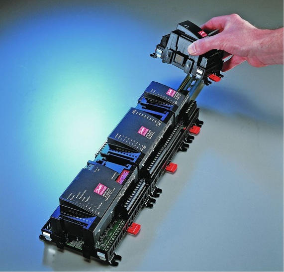 Dessen Spannungsversorgung und Busverbindung erfolgt über eine Kontaktleiste. Bild 1 verdeutlicht, dass dieses Hardware-Konzept Einsparungen bei Verdrahtung, Platzbedarf, Servicebevorratung und Inbetriebnahme ermöglicht. Falls die Breite des Schaltschranks für große Anwendungen mit vielen Erweiterungsmodulen nicht ausreicht, können über ein Kommunikationsmodul in zweiter Reihe weitere Erweiterungsmodule hinzugesteckt werden.