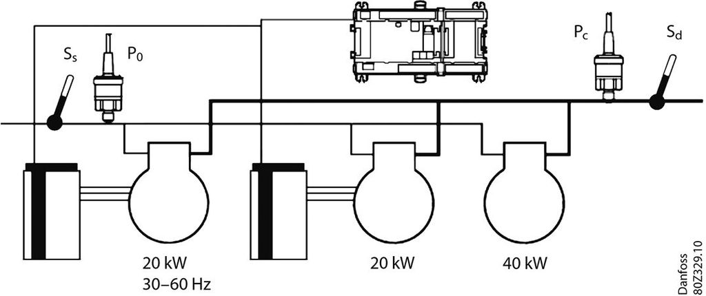 Der Verbundanlagenregler unterstützt auch die Regelung einer sehr kleinen Verbundanlagen-Teillast. Beispielsweise beträgt die Kühllast im Winter und im Nachtbetrieb oft lediglich 20 Prozent der Volllast. Um einen Taktbetrieb der Kaskade zu vermeiden, empfiehlt sich die Anwendung mit zwei drehzahlgeregelten Verdichtern (Bild 3). Damit lässt sich eine Teillast bis herunter zu 12,5 Prozent der Volllast ohne Taktbetrieb regeln. Im Beispiel wurden Verdichter mit unterschiedlichen Leistungen gewählt, sodass der Best-fit-Betrieb zur Anwendung kommt.