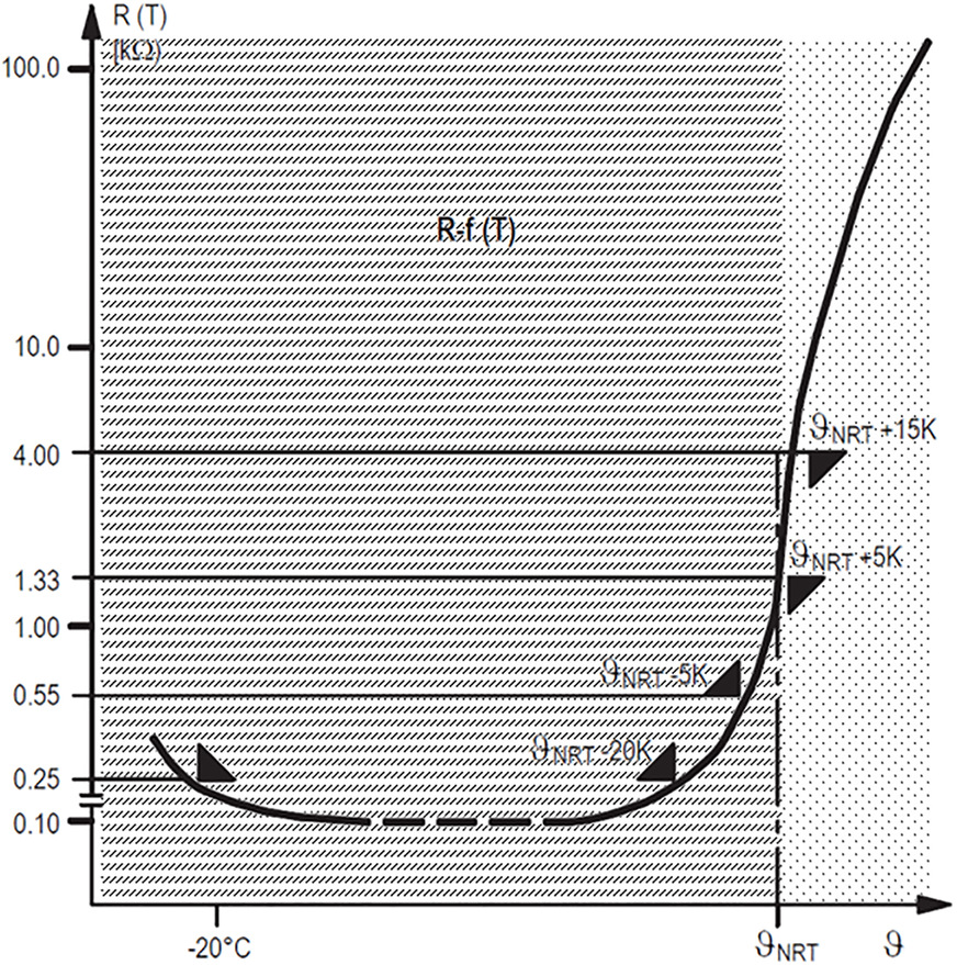 Nun lässt sich insbesondere die Wicklungstemperatur bei fast allen Verdichtern aber nicht mit Zwischenwerten auslesen: Bei Verdichtern werden fast immer PTCs als Sensoren für die Motortemperatur eingesetzt, die sich wie ein „Schalter“ mit einem sprunghaft erhöhten Widerstandswert verhalten, sobald der Motor zu heiß wird und abgeschaltet werden muss.