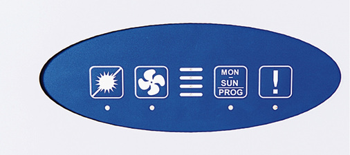 Mit den vier Buttons der übersichtlichen Folientastatur kann der Nutzer alle Basisfunktionen seiner Lüftungsanlage steuern. Zum einen sind die vier Lüftungsstufen (Stufe 1 = 1F, Feuchteschutz; 2 = reduzierte Lüftung; 3 = Nennlüftung; 4 = Intensivlüftung) einzustellen und zum anderen die zehn vorbelegten Wochenprogramme wählbar. Mit dem Bypass-Button kann der Sommer-Modus oder der automatische Sommer-Bypass manuell eingeschaltet werden. Der vierte Button zeigt einen notwendigen Filterwechsel an.