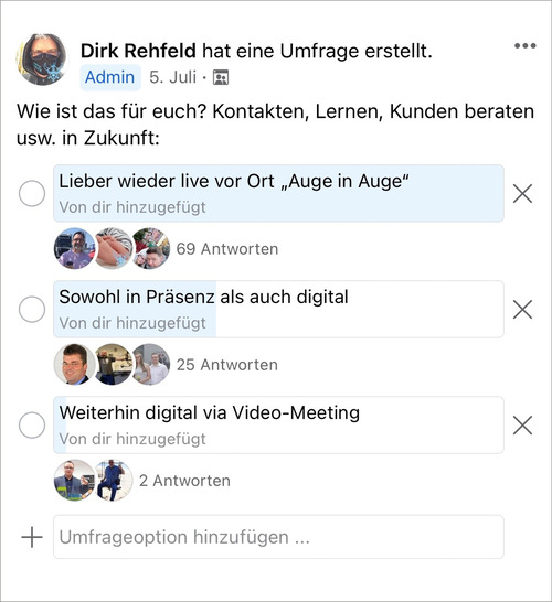 Ich wollte via einer Umfrage auf Facebook und LinkedIn wissen, wie unsere Branche es sieht: Trifft man sich lieber live vor Ort, digital in Video-Meetings oder in beiden Varianten?