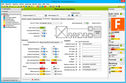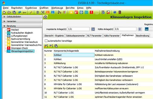 Das Modul EVEBI – Klimaanlagen-Inspektion – ist in der Energieberatungssoftware EVEBI integriert, sodass neben einer Inspektion auch weitere Aufgaben im Bereich der energetischen Gebäudebewertung durchgeführt werden können.