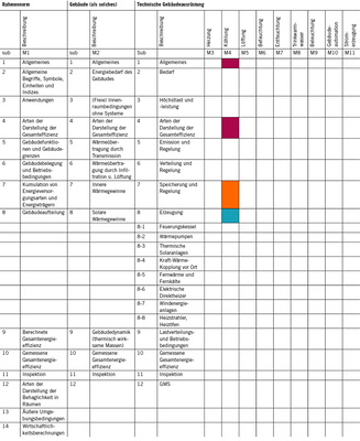 Ein Beispiel für eine umzusetzende Norm ist die DIN EN 16789 mit Teil 9 [2], Teil 13 [3] und Teil 15 [4]. Die Zuordnung in der allgemeinen Matrix ist Tabelle 1 (Seite 18) zu entnehmen (rotes Feld: Teil 9; grünes Feld: Teil 13; oranges Feld: Teil 15).