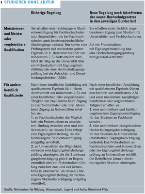 Personen, die eine berufliche Ausbildung mit qualifiziertem Ergebnis abgeschlossen haben, können nach mindestens zweijähriger beruflicher Tätigkeit ohne den Umweg über ein Probestudium jedes Studium an einer Fachhochschule aufnehmen. An Universitäten steht der Weg zu allen Studiengängen offen, die mit der Berufsausbildung verwandt sind. Darüber hinaus wird im neuen Hochschulgesetz eine Experimentierklausel verankert, die es ermöglicht, noch über die eben genannten Regelungen hinauszugehen. Auch wenn dies zunächst eine landespezifische Regelung ist, so hat die Kultusministerkonferenz (KMK) sich darauf verständigt, dass beruflich qualifizierte Studierende nach einem Jahr erfolgreichen Studiums auch an Hochschulen in den anderen Bundesländern wechseln können.