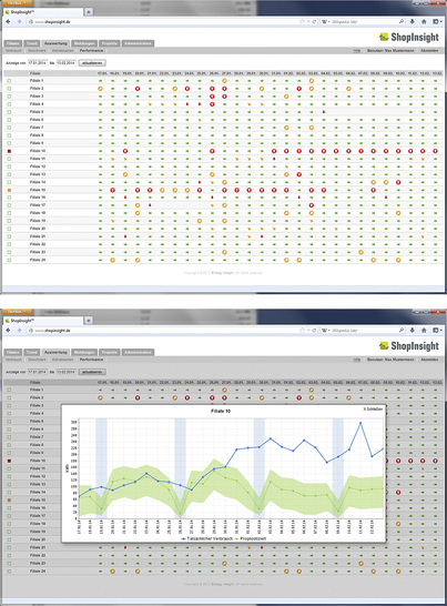 Der Ist-Verbrauch der einzelnen Filialen wird jeden Tag im ShopInsight Webportal anhand einer Energie-Ampel aufgezeigt und bewertet. Wenn der Ist-Verbrauch einen Tag aus dem Energiekorridor abweicht, kann daraus nicht gleich auf eine generelle Verschlechterung des Energieverbrauchs der Filiale geschlussfolgert werden, deshalb kumuliert die Energie-Ampel die einzelnen Bewertungen. Bei einer geringen Abweichung einer Filiale zählt die Ampel den Wert 1 hoch, bei einer höheren Abweichung wird auf den Wert 2 erhöht, läuft die Filiale am nächsten Tag wieder im festgelegten Energiekorridor, so wird wieder der Wert 1 abgezogen. Der Kunde kann eine individuelle Alarmschwelle definieren. Erreicht die Energie-Ampel diese Schwelle, so wird ein Alarm per E-Mail an ausgewählte Personen gesendet und diese über die schleichende Verschlechterungen von Betriebszuständen informiert.