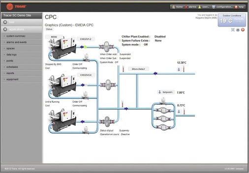 Neben den Kaltwassersätzen steuert der Chiller Plant Manager auch alle anderen Komponenten eines Kalt- und Kühlwassersystems sowie ihre Einsatzreihenfolge und benachrichtigt Anwender, wenn planmäßige Wartungen erforderlich sind. Funktionen wie Datentrends ermöglichen die Überwachung von wichtigen Parametern der Gesamtanlage.