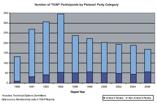 In diesen Committees arbeiteten 1992 etwa 370 Experten aus entwickelten Ländern und Entwicklungsländern (vgl. Bild 3). Diese Zahl ist seitdem zurückgegangen, weil die meisten Problemstellungen bei ozonschädlichen Stoffen im Moment schon bearbeitet und ausgewertet sind. Immerhin sind hier im Moment noch etwa 175 Experten mit technischen Assessments beschäftigt.