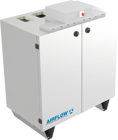 Die Stand-Lüftungsgeräte der Serie DuplexBase PT von Airflow benötigen deutlich weniger Bodenfläche und eignen sich daher für enge Einbausituationen. Hier sind die Kanalanschlüsse vertikal statt seitlich verbaut und Kühl- sowie Heizregister können als Zusatzoption integriert werden, wodurch Platz gegenüber externen Registern eingespart wird. Die fünf Modelle gibt es in maximalen Volumenstrombereichen von 500 bis 3500 m³/h. Die Geräte werden per Plug-and-Play in Betrieb genommen. Über einen integrierten CO2-Sensor kann die benötigte Frischluftzufuhr bedarfsgerecht gesteuert werden. Auf diese Weise wird auch die Konzentration an Aerosolen reduziert. Eine komfortable Bedienung, auch online über einen Webserver, unterstützt ein angenehmes und gesundes Raumklima. Der eingebaute Kreuzgegenstrom-Wärmeübertrager erzielt einen Wärmerückgewinnungsgrad von bis zu 90 Prozent. Als Schnittstelle an die Gebäudeleittechnik stehen Modbus sowie optional BACnet und KNX zur Wahl.