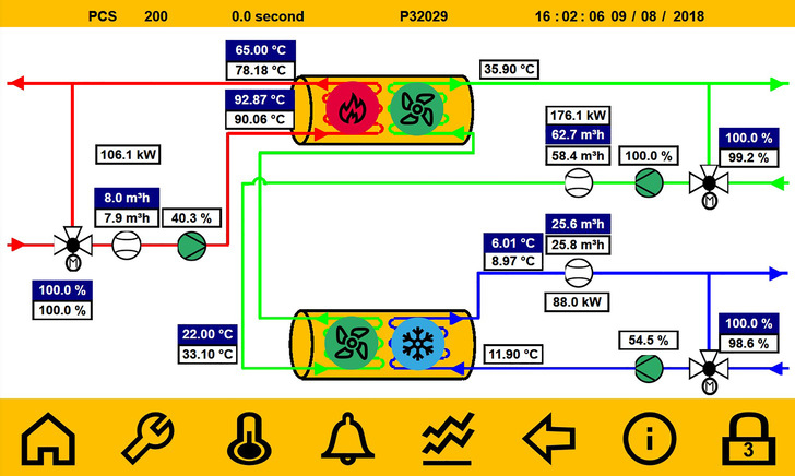 Absorptionskältemaschinen Biene, Hummel und Hornisse von Baelz mit den Leistungsklassen 50 kW, 160 kW und 500 kW stellen nun auf einem Touchscreen eine Visualisierung mit Trendaufzeichnungen und Online-Istzeitüberwachung dar. Angezeigt werden Ein- und Austrittstemperatur von Kalt-, Kühl- und Wärmequellenkreis sowie Stellsignale der Pumpen und Regelventile. Auf der Balkendarstellung mit den Ampel-Farben Grün, Gelb und Rot ist sofort der Anlagenzustand erkennbar. Daneben können beliebige Tages-, Wochen- und Monatssperren eingestellt werden. Optional ist ein Fernwartungsrouter auf die Anlagen aufschaltbar. Damit lassen sich Betreiber bei der Systemoptimierung unterstützen und im Störungsfall die möglichen Fehlerquellen einschränken. Erforderliche Systemanpassungen sind online durchführbar. Im Reparaturfall wird durch die Fehleranalyse die Ersatzteilplanung unterstützt, was Ausfallzeiten und Reparaturkosten minimiert.