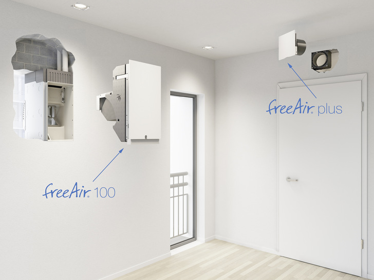 Das Lüftungssystem freeAir von bluMartin verringert den planerischen und baulichen Aufwand bei hohem Wohnkomfort und effektivem Feuchteschutz. Herzstück ist das wohnungszentrale Außenwand-Lüftungsgerät freeAir 100 mit Zweitraum-Abluft. Eine kaskadierte Luftführung erledigt die Verteilung der frischen Luft vom freeAir 100 zu den Ablufträumen. Zusätzliche Räume werden über den intelligenten aktiven Überströmer freeAir plus an die Wohnraumlüftung angebunden. Zuluftleitungen werden nicht benötigt. Auch Brandschutzklappen und deren Wartung entfallen, weil die Lüftung nicht brandabschnittübergreifend angelegt ist. In der Rohbauphase wird zunächst nur der robuste Mauerkasten in die Wand eingesetzt und an den Strom angeschlossen. Nach Abschluss der Rohbauarbeiten und Montage der Außenhaube wird das Lüftungsgerät in den Mauerkasten geschoben. Justier- und Einstellarbeiten sind nicht erforderlich. Lediglich die Raumgröße und der angeschlossene Leitungsquerschnitt für die Abluftleitung werden einmalig über die DIP-Schalter unter der Frontplatte eingestellt. Weil das Gerät automatisch volumenkonstant arbeitet, entfallen auch alle Einmessarbeiten an den Luftventilen. Auch für den aktiven Überströmer freeAir plus gibt es nun einen Rohbaublock.