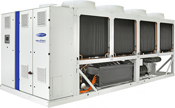Flüssigkeitskühler AquaForce Vision 30KAV von Carrier sollen Kühlleistungen von 500 bis 1100 kW erbringen und erreichen eine hohe saisonbezogene Effizienz. Die Geräte sind mit drehzahlgeregelten Schraubenkompressoren und Ventilatoren ausgestattet. Zur Wahl stehen dabei Modelle mit Asynchronmotor und mit elektrisch kommutiertem Motor (EC-Motor). Auch eine Pumpe mit variabler Drehzahlregelung ist optional möglich. Kühlleistung und Wasserstrom werden automatisch an die jeweiligen Gebäudelasten und sonstigen Umgebungsbedingungen angepasst. Die Flüssigkeitskühler (Betriebsschallpegel 90 dB(A)) bieten einen SEER-Wert von bis zu 5,5 im Kühlbetrieb und einen EER-Wert von bis zu 3,49 bei Volllast. Sie eignen sich für Außentemperaturen von 20 bis 55 °C und auch für Wassertemperaturen unter dem Gefrierpunkt. Das Modell PureTec 30KAV-ZE ist für den Einsatz des Kältemittels HFO R1234ze mit niedrigem Treibhauspotenzial (GWP) ausgelegt. www.carrier.com