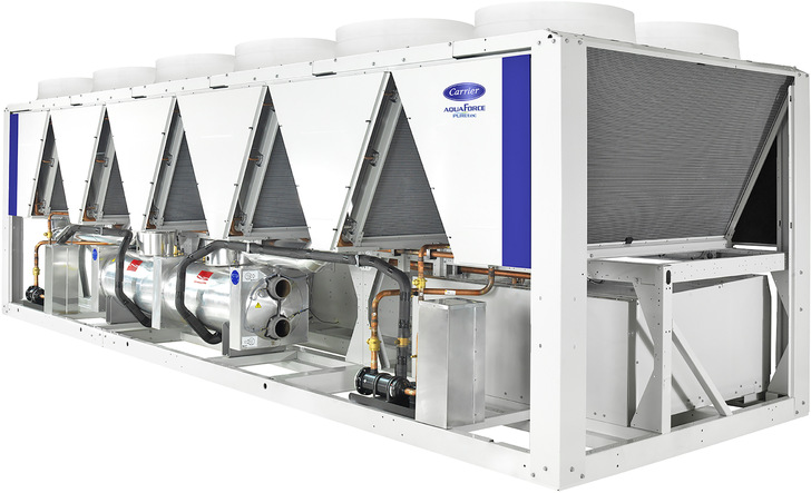 Die luftgekühlten Schrauben-Flüssigkeitskühler AquaForce 30XB / P-ZE von Carrier mit fester Drehzahl gibt es jetzt mit PUREtec-HFO-Kältemittel (R1234 ze). Die Baureihe deckt Kühlleistungen von 200 bis 1 200 kW ab und weist eine jahreszeitbedingte Energieeffizienz (SEER) bis 4,52 und eine Jahresarbeitszahl (SEPR) bis 6,19 aus. Sie ist mit Doppelschraubenverdichter und Mikrokanal-Wärmeübertrager aus Vollaluminium mit Beschichtung ausgestattet.