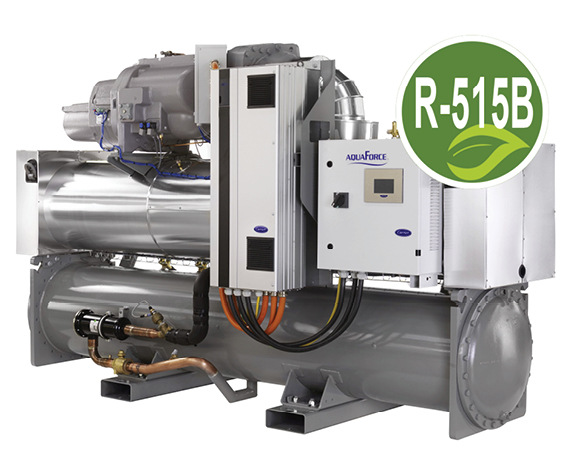 Carrier bietet seine AquaForce Schrauben-Kaltwassersätze für die Aufstellung innerhalb eines Gebäudes, bisher mit R 134a oder R 1234ze befüllt, alternativ mit R 515B an. Nun ist das Global Warming Potential nur einer der Faktoren, die in die Suche nach einem neuen Kältemittel eingehen. Daneben spielen Energieeffizienz, Sicherheit und Wartungsbedarf eine Rolle. Das neue Kältemittel soll nicht-toxisch und nicht oder nur schwer entflammbar sein. Und es soll mindestens genau so effizient sein wie das Kältemittel, das es ersetzt. R 515B ist eine Mischung aus R 1234ze und R 227ea im Verhältnis 91,1 zu 8,9 %. Sein GWP ist nur etwa halb so hoch wie das des Kältemittels R 513A, das ebenfalls für wassergekühlte Kaltwassersätze und Wärmepumpen im Gespräch ist. R 515B ist nicht-toxisch und nicht entflammbar und in die höchste Sicherheitsklasse A1 eingestuft. Das heißt, es gelten für die Maschinen die gleichen Vorkehrungen und Vorschriften für Wartung und Betrieb wie für R 134a. Die Mischung macht’s: Das reine R 1234ze, mit einem GWP von unter 1, hat eine A2L-Klassifizierung. Was die Energieeffizienz betrifft, schneiden sowohl R 515B als auch R 1234ze besser ab als die ursprüngliche R 134a Variante. R 515B ist außerdem um ca. 5 % besser verglichen mit R 513A, was sich in geringeren Betriebskosten während der Lebensdauer der Maschine niederschlägt.