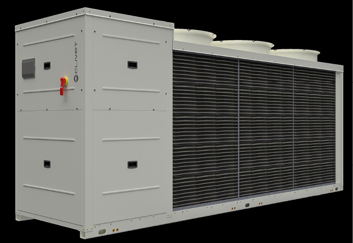 Die Large EVO FC Serie bietet luftgekühlte Kaltwassersätze mit R 32 in den Versionen Excellence (EXC) und Premium (PRM). Sie verfügt über Full-Inverter-Technologie bei Verdichtern, Ventilatoren und Pumpenaggregaten. Dies ermöglicht einen Betrieb bis - 25 °C Außentemperatur und eine Kaltwassererzeugung bis - 8 °C. Die ZET-Werte (Zero Energy Temperature) liegen bei bis zu 2,1 °C (EXC) und 1,1 °C (PRM) im Free-Cooling-Modus. Die saisonale Effizienz erreicht Werte bis zu SEER 4,94 und SEPR HT 6,18. Die EXC-Version bietet 100 % der Nennleistung (A 30 / W 10) im Free-Cooling-Modus bei 0 °C Umgebungstemperatur, während die PRM-Version 87 % der Nennkapazität erreicht.