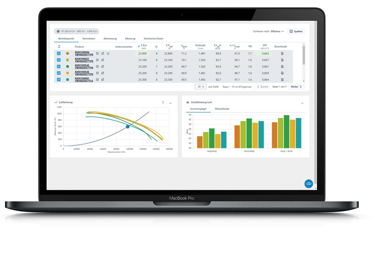 Abmessungen und spezifischer Messdaten. Wer mehr technische Details möchte, kann zudem den Expertenmodus nutzen, der z.B. noch Wirkungsgradkennlinien darstellt. Im Downloadbereich stehen alle Datenblätter und Betriebsanleitungen in mehreren Sprachen zur Verfügung. Mittels PDF-Export lässt sich die Auswahl druckreif abspeichern.