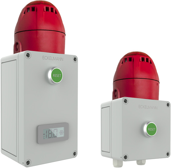 Die E*LDS Alarmbox Maxi (B x H x T: 110 x 180 x 90 mm) von Eckelmann eignet sich für CO2-Gaswarngeräte, Temperaturalarme und mehr. Das kombinierte optisch-akustische Signalgerät lässt sich optional mit einer digitalen Temperaturanzeige (BT30) ausstatten. Über einen potentialfreien Kontakt werden Alarmmeldungen aufgeschaltet. Durch einen zusätzlichen potentialfreien Wechselkontakt kann die Alarmmeldung auch auf weitere Meldegeräte geschaltet werden. Um das Alarmsignal mit einem pulsierenden Ton von 90 bis 95 dB zu deaktivieren, muss die frontseitige Reset-Taste gedrückt werden. Das optische Signal (Blitzleuchte) bleibt nach einem Reset solange bestehen, wie der Alarm ansteht bzw. bis die Ursache behoben wurde. Speziell für CO2-Gaswarngeräte gibt es darüber hinaus die E*LDS Alarmbox Mini (B x H x T: 110 x 110 x 90 mm). Sie hat eine Blitzleuchte mit Hupe in 24-VDC-Ausführung. Hupe, Blitzleuchte und Reset-Taste sind auf Klemme verdrahtet, somit kann die Alarmbox an fast jedes Gaswarnkontrollsystem mit 24 VDC digitalem Ausgang angeschlossen werden.