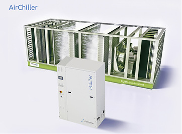 Der AirChiller ist eine luftgekühlte Kältemaschine für die Außenaufstellung mit einer Kälteleistung von 70 kW. Er vereint die Vorteile des glykol- und chemiefreien Lumi-Rückkühlers von Michelbach sowie der eChiller-Modellreihe von Efficient Energy, die mit dem Kältemittel Wasser (R 718) betrieben wird. Der Rückkühler arbeitet mit Frischwasser sowie Hochdruckbefeuchtung und ist mit oder ohne Adiabatik zu haben. Das System ist hygienezertifiziert nach VDI 2047, Blatt 2. Beide Komponenten sind hydraulisch und regelungstechnisch verschaltet. Durch die integrierte freie Kühlung und die energieoptimierte Regelung in allen Betriebspunkten erfüllt der AirChiller die Anforderungen der Ökodesign-Richtlinie. Er erreicht eine hohe Betriebssicherheit; zeit- und kostenaufwändige Betreiberpflichten entfallen, da das Komplettmodul-System chemiefrei betrieben wird. Das Gerät ist für niedrige Kühlwassertemperaturen bei hohen Außentemperaturen ausgelegt. Mit der frostsicheren Ausführung der Kompletteinheit lässt sich Wasser als Kältemittel auch im Winter außerhalb eines Gebäudes betreiben. www.efficient-energy.de