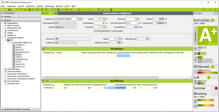Mit einem neuen Modul in der Software Evebi von Envisys werden in wenigen Schritten für jeden Raum die Spreizungen und Übertemperaturen und für jedes Heizkörperventil Volumenströme und Durchlasswerte ausgegeben. Alle gängigen Heizkörper und Heizkörperventile sind in der Software hinterlegt. Da das Modul in Evebi integriert ist, können die in der Beratungssoftware bereits vorhandenen Daten eines Projektes genutzt werden. Wurde bereits eine Heizlastberechnung durchgeführt, so können diese Daten für den hydraulischen Abgleich verwendet werden. Nach Eingabe der Heizfläche, des Rohrdurchmessers, der Rohrabstände und des Bodenbelags wird die installierte Leistung berechnet. Alle Angaben zum hydraulischen Abgleich der Flächenheizung werden in einem Bericht dokumentiert.