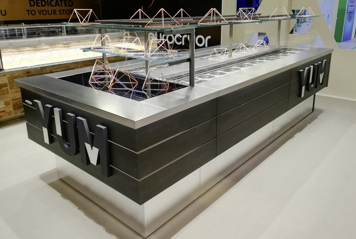 An der Verkaufsinsel Cornice von Epta können Kunden sich selbst kalte und warme verzehrfertige Speisen zusammenstellen. Das Kühlmöbel verbindet Edelstahl mit Glas und setzt auf eine attraktive Warenpräsentation. Auf beiden Seiten der Kühlinsel können Salate, Gemüse und Beilagen angeboten werden. Das flache Kopfteil mit Produkthaltern eignet sich für Nüsse, Kerne und andere Trockenprodukte. Warme Snacks wie Pizza, Focaccia oder Quiches finden im passenden halbhohen Kopfmöbel mit integrierter Heißtheke Platz. Es schließt bündig an die Selbstbedienungstheke an. Für ein noch größeres Angebot lässt sich auf der anderen Seite ein weiteres Kopfmöbel für Trockenprodukte sowie Behälter, Tabletts und Waage ergänzen. Die Verkaufsinsel lässt sich individuell gestalten und damit an jedes Ambiente anpassen: Höhe, Farbe und Material der umlaufenden Paneele sind frei wählbar. Damit die Produkte gut präsentiert und gleichzeitig geschützt werden, bestehen neben den Etageren und Warmhalteplatten auch die Kopf- und Seitenteile sowie die Rückwände aus Glas. Ablageflächen, Wanne und umlaufende Ablage sind aus rostfreiem Edelstahl. Die Verkaufsinsel mit Kühlfunktion gibt es in den Längen 125, 187 und 250 cm, die beiden Kopfmöbel sind jeweils 139,5 cm lang. Die Insel liegt sowohl als steckerfertiges Möbel als auch in der Remote-Version zum Anschluss an eine externe Kälteanlage vor.