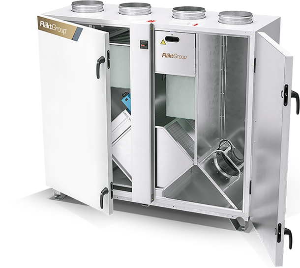 Als Teil der Lüftungsanlagen von FläktGroup mit einem Luftvolumenstrom von 360 bis 109 000 m3/h gibt es nun die aktualisierte Kompaktversion eCO TOP & eCO SIDE mit 360 bis 2880 m3/h. Merkmale sind eine einfache Installation, variable Anschlussmöglichkeiten, eine intelligente Regelung und zusätzliche Funktionalitäten. Unter anderem ist die City-Version mit einem zweiten Filter (Filterklasse ISO PM 1 80 % F 9) für schwierige Außenluftsituationen ausgestattet. Als Basisfilter dienen Taschenfilter der Klasse ISO PM 1 55 % (F 7) für niedrigen Druckverlust und hohe Effizienz. Weitere Optionen, wie ein hygroskopischer Rotor für eine verbesserte Luftfeuchte und bis zu 85 Prozent Energieleistung und ein frostgeschützter Gegenstrom-Plattenwärmeübertrager mit bis zu 83 Prozent Energierückgewinnung, sind ebenfalls im Programm. Die Lüftungseinheit passt durch eine 900 mm-Türöffnung. Ein intuitives HMI vereinfacht die Inbetriebnahme. Das Gerät eCO SIDE (Anschlüsse seitlich) ist zur Außenaufstellung vorgesehen. Der Geräuschpegel liegt bei < 35 dB(A) in 3 m Abstand.