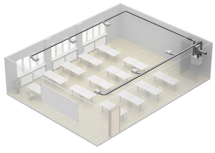 Das Schullüftungssystem Centra 1000 belüftet Klassenräume bis 30 Personen nach DIN-Vorgaben – die Auslegung kann zum Beispiel nach DIN EN 16798-1 erfolgen. Centra ist in unterschiedlichen Größen mit einem Luftvolumenstrom bis 953 m³/h verfügbar. Das Schullüftungssystem von inVENTer besteht aus einem kompakten Lüftungsgerät aus verzinktem Stahl, welches im Klassenzimmer an Wand oder Decke oder wahlweise im Nebenraum platziert werden kann. Der integrierte Rotationswärmetauscher sowie EC-Ventilatoren ermöglichen eine Wärmerückgewinnung von 82 %. Ein Nachheizregister stellt dabei die gleichbleibende Temperatur der einströmenden Luft sicher. Aerodynamisch abgestimmte Komponenten und balancierte Ventilatoren garantieren eine leise Belüftung mit einem Schalldruckpegel von lediglich 36 dB(A). Die Steuerung erfolgt über das Steuerungssystem C6M im Gerät – optional mit einem Touchpanel, per App oder per Fernzugriff am PC.