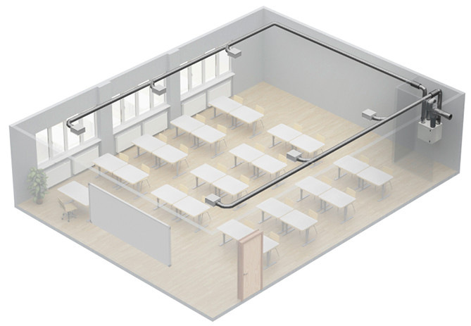 Das Schullüftungssystem Centra 1000 belüftet Klassenräume bis 30 Personen nach DIN-Vorgaben – die Auslegung kann zum Beispiel nach DIN EN 16798-1 erfolgen. Centra ist in unterschiedlichen Größen mit einem Luftvolumenstrom bis 953 m³/h verfügbar. Das Schullüftungssystem von inVenter besteht aus einem kompakten Lüftungsgerät aus verzinktem Stahl, welches im Klassenzimmer an Wand oder Decke oder wahlweise im Nebenraum platziert werden kann. Der integrierte Rotationswärmetauscher sowie EC-Ventilatoren ermöglichen eine Wärmerückgewinnung von 82 %. Ein Nachheizregister stellt dabei die gleichbleibende Temperatur der einströmenden Luft sicher. Aerodynamisch abgestimmte Komponenten und balancierte Ventilatoren garantieren eine leise Belüftung mit einem Schalldruckpegel von lediglich 36 dB(A). Die Steuerung erfolgt über das Steuerungssystem C6M im Gerät – optional mit einem Touchpanel, per App oder per Fernzugriff am PC. www.inventer.de