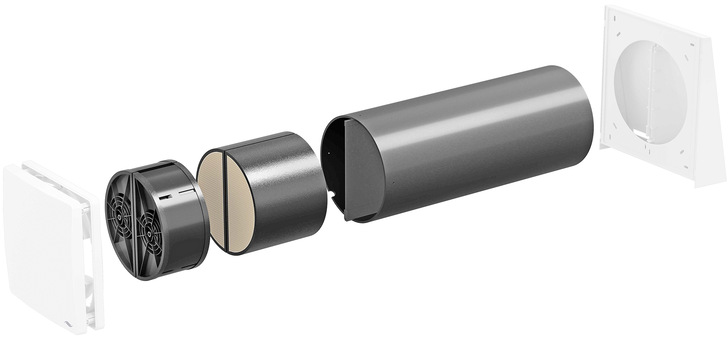 Der Einzelraumlüfter iV-Twin+ von InVenter vereint zwei Lüftungsgeräte in einem, wodurch der für dezentrale Lüftungssysteme typische paarweise Betrieb entfällt. Damit eignet er sich für die Lüftung von klassischen Ablufträumen wie Küche oder Bad sowie kleinen Ferienapartments oder Bungalows. Die beiden Xenion-Ventilatoren laufen parallel im Gegentakt. Dabei führt ein Ventilator frische Luft zu und der andere gleichzeitig die verbrauchte Raumluft ab. Zudem gibt es zwei getrennte Wärmespeicherhälften mit Keramikwaben, die in Summe eine Wärmerückgewinnung von 94 Prozent (DIN EN 13141-8) bewirken. Durch den verbesserten Abluftmodus von 45 m3/h ist ein erhöhter Feuchteschutz gegeben. Das Gerät hat vertikale Trennelemente in Innenblende, Wandeinbauhülse und Wetterschutzhaube, sodass der Luftvolumenstrom im Gerät getrennt wird. Wegen seines Durchmessers von 200 mm benötigt der Lüfter lediglich eine Wandöffnung von 225 mm. Steuerbar ist er mit den Reglersystemen sMove und MZ-Home des Herstellers. Zusammen mit einem Hygrostat HYG18 als Zubehör ist eine bedarfsgeführte Lüftung mit Feuchteüberwachung und Temperaturanzeige möglich (Effizienzklasse A+). Ein Temperaturwächter verhindert ein Auskühlen des Wohnraums bei kalten Außentemperaturen, ein Winddruckstabilisator schützt gegen Laufgeräusche bei starkem Winddruck. Die Standard-Filter können durch Pollen- oder Aktivkohlefilter ersetzt werden.