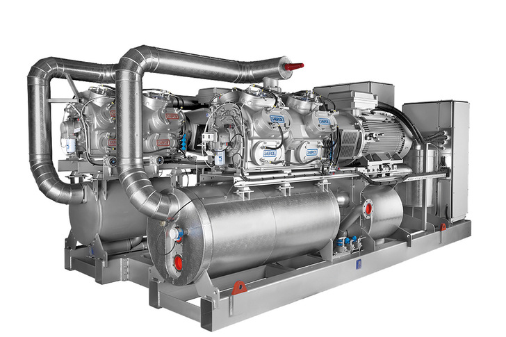 Johnson Controls stellt in Nürnberg seine neue zweistufige Hochtemperatur-Großwärmepumpe „Sabroe DualPAC“ vor. Die gezeigte Version, Modell 708, wird im Original in Halle 7 am Stand 240 zu sehen sein. Sie hat eine Länge von 5,70 Metern, eine Breite von über 2,70 Metern, eine Höhe von mehr als 2,10 Metern und wiegt mehr als 10 Tonnen. Die Heizleistung dieses Modells beträgt 760 Kilowatt. Die DualPAC-Wärmepumpenserie wurde speziell für Anwendungen mit hohen Temperaturanforderungen entwickelt. Sie ermöglicht Austrittstemperaturen von bis zu 90 °C bei einer konstant hohen Heizleistung, auch bei niedrigen Quelltemperaturen. Dadurch sind die Geräte besonders geeignet für Fernwärmeanlagen und Erdreich-Kühlsysteme. Die Baureihe umfasst 17 Modelle, die einen Leistungsbereich von 400 bis 3.000 Kilowatt abdecken. Dank ihrer modularen Bauweise vereinen die Pumpen die Eigenschaften der etablierten Sabroe ChillPAC- und HeatPAC-Systeme, was zu einer kompakten Bauweise und hoher Wirtschaftlichkeit führt. Die Wärmepumpen der DualPAC-Reihe zeichnen sich durch einen schwingungsarmen Betrieb und eine hohe Betriebssicherheit aus, da sie nur wenige bewegliche Teile enthalten. Dies führt zudem zu reduzierten Wartungskosten. Als Kältemittel wird Ammoniak verwendet, wobei der Bedarf durch einen speziell entwickelten Zwischenkühler minimiert wird.