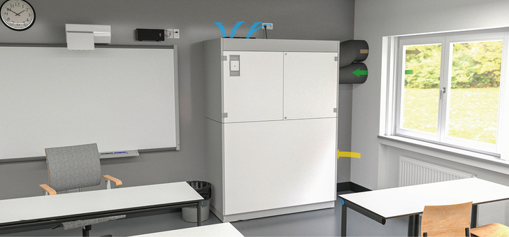 Ein dezentrales Lüftungsgerät für den Einsatz in Schulen bietet Kampmann an. Für die Installation sind nur geringe bauliche Maßnahmen nötig, die sich auf den jeweiligen Klassenraum beschränken und autark von bestehenden Installationen – wie Heizung und Abwasser – ausgeführt werden können. Aufgrund der geringen Außenmaße von 150 x 66 x 210 cm ist außerdem eine variable Positionierung im Raum möglich. Dadurch eignet sich das Gerät insbesondere für eine (sukzessive) Nachrüstung in bestehenden Schulgebäuden. Bei dem Gerät handelt es um eine steckerfertige Lösung, d.h. für die Montage und Inbetriebnahme wird kein Elektriker benötigt und die Geräte sind nach Aufstellung direkt einsatzbereit. Auch sämtliche Luftumlenkungen mit Absperrklappen sind bereits ab Werk verdrahtet. Der integrierte CO2-Sensor und eine entsprechende Auslegung der Luftmengen garantieren den Einsatz nach gängigen Normen. Zudem erfüllt die Luftleistung die Vorgaben für die BAFA-Förderung.