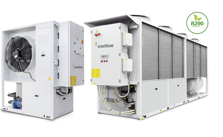 Die reversiblen Wärmepumpen und Kaltwassersätze der Enerblue Serie werden mit dem natürlichen Kältemittel R 290 betrieben. Sie sind als Luft/Wasser- und Wasser/Wasser-Ausführungen erhältlich. Sie ermöglichen Wassertemperaturen von bis zu 80 °C. Integrierte Freikühlmodule sorgen für Energieeinsparung bei der Kaltwassererzeugung. Sie sind in ihrer Leistung variabel regelbar. Das Angebot von Enerblue umfasst Konfigurationsmöglichkeiten, Kaskadenverbindungen mit bis zu sechs Einheiten und Steuer- und Regeleinrichtungen.
