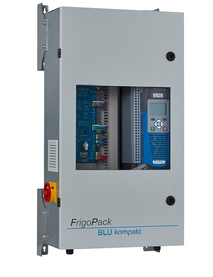 Der FrigoPack BLU kompakt übernimmt die komplette Regelung und Ansteuerung der Einzel- oder Zweiverdichteranlage. Dank des Plug-and-Play-Konzepts müssen nur Netz- und Motorkabel, sowie die Drucktransmitter und der Sicherheitskreis angeschlossen werden. Da der Kältefrequenzumrichter standardmäßig voreingestellt wird, läuft die Inbetriebnahme in kürzester Zeit ab. Hilfreich dabei ist auch der integrierte Handbetrieb. Um die Anlagensicherheit zu gewährleisten wechselt der FU im Falle einer Störung automatisch in den Notbetrieb. Die integrierte FrigoComp Steuerbaugruppe zeigt mittels grüner und roter LEDs den Status der Anlage an. Erhältlich ist diese Systemlösung für Kälteleistungen bis 50 kW im Normaltemperaturbereich und bis 20 kW im Niedrigtemperaturbereich.