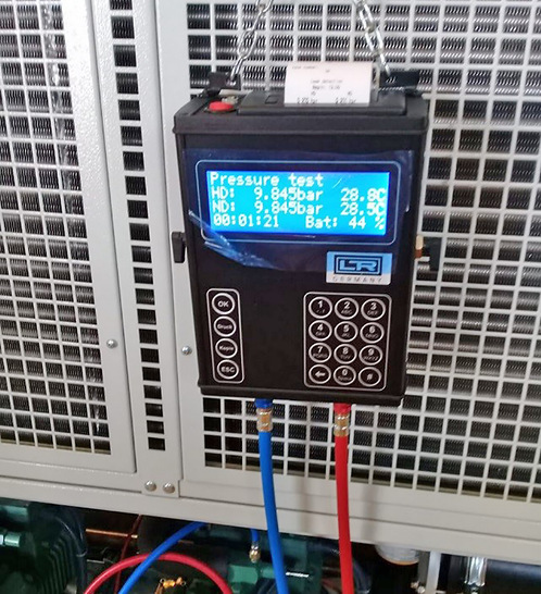 Mit dem System SLD_01 von Leitenberger lassen sich mit Hilfe von Formiergas oder Stickstoff die Druckverhältnisse im Nieder- und Hochdruckbereich von Kälteanlagen in Echtzeit bis auf ein Hundertstel bar präzise messen. Mithilfe eines integrierten Druckers wird das Ergebnis protokolliert. Zunächst wird das Gerät über den Nieder- und Hochdruckservice-Anschluss an die entleerte Kälteanlage angeschlossen. Der Füllschlauch wird mit dem Druckminderer der Gasflasche verbunden. Nach dem Einlassen des Formiergases werden Messung und Protokollierung gestartet. Eventuell abfallender Druck wird präzise im Nieder- oder Hochdruckbereich angezeigt und auf dem Ausdruck protokolliert. Anschließend kann mit dem optionalen Lecksuchgerät ELS 04 die Leckage lokalisiert werden. Es ist eine Messzeit bis zu 24 h möglich. Die Anzeige der Stickstoffprüfung erfolgt auf 0,1 bar genau, die der Lecksuchprüfung auf 0,01 bar genau (Messgenauigkeit 0,5 Prozent).