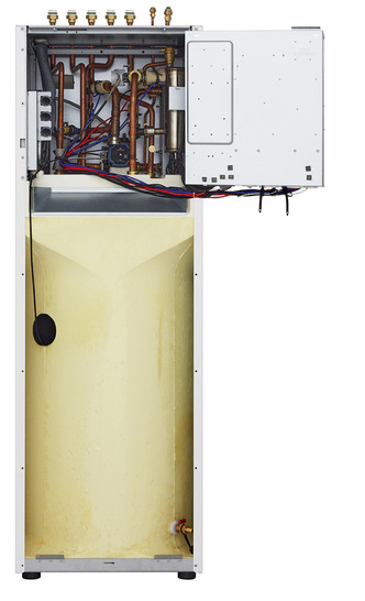 Die neuen Modelle der Serie Therma V R 32 IWT (Integrated Water Tank) kombinieren Wärmepumpen-Innengeräte mit Trinkwassertanks. Mit Heizleistungen von 5, 7 und 9 kW decken sie den Heiz- und Warmwasserbedarf der meisten Wohnhäuser ab. Das Kältemittel R 32 trägt zu einem umweltfreundlichen Betrieb bei: Es weist ein geringes Treibhauspotenzial (GWP) von 675 auf. Alle hydraulischen Komponenten wie Ausdehnungsgefäß, die Pumpe für die Heizung, Durchfluss- und Wasserdruck-Sensoren sowie ein 200 Liter Trinkwasserspeicher sind vollständig in die Inneneinheit integriert. Das Gerät erreicht bei durchschnittlichen mitteleuropäischen Temperaturen und einer Vorlauftemperatur von 35 °C die jahreszeitliche Raumheizungseffizienzklasse A+++, bei einer Vorlauftemperatur von 55 °C die Effizienzklasse A++. Im Vergleich zu den Vorgängermodellen erreichen die aktuellen Therma V R 32 IWT Geräte höhere Jahresleistungszahlen (SCOP) von 4,65 bei 35 °C Vorlauftemperatur und 3,23 bei 55 °C Vorlauftemperatur.