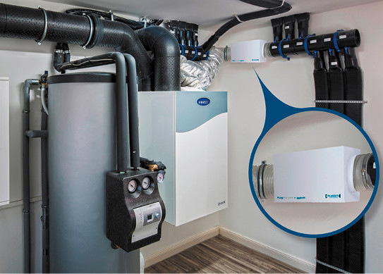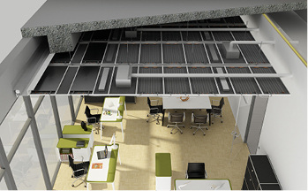 Die Lüftungskomponente Plafotherm AirHybrid wurde speziell für Plafotherm Heiz-/Kühldeckensysteme von Lindner entwickelt. Deckensegel und geschlossene Metalldeckensysteme können so als Lüftungsdecken ausgeführt werden. Komfort und Leistung in einem Heiz- / Kühlsystem werden mit der thermoaktiven Hybridkühlung vereint. Auch bei Spitzenlasten und in Bereichen mit stark erhöhtem Wärmeeintrag kühlt das Hybridsystem effektiv. Die Abluft wird laufend durch die Deckenperforation aus dem Raum abgeführt. Das Lüftungsgehäuse ist rückseitig verdeckt in die Deckenplatten integriert und raumseitig nicht sichtbar. Durch die perforierten Deckenplatten verteilt sich die Luftausströmung gleichmäßig temperiert nach unten bzw. oberhalb der Decke ohne unangenehme Zugluft zu erzeugen. Die Deckenplatten selbst lassen sich werkzeuglos abnehmen. Die Lüftungskomponente ist abnehmbar und kann somit gemäß VDI 6022 gereinigt werden. Es sind wasserseitige Kühlleistungen bei Deckensegeln bis 192 W/m 2 (10 K) und wasserseitge Heizleistungen bis 165 W/m 2 (15 K) erreichbar. Die Zulufttemperatur reicht von 16 bis 20 °C, die Luftwechselraten von 2- bis 6-fach (oder 60 bis 120 m 2 /h je Lüftungshaube).