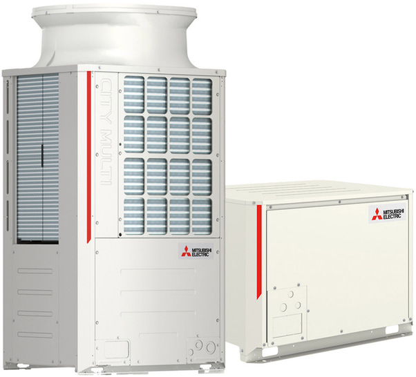 Hybrid-BC-Controller / Hydro Unit und allen Innengeräten wird Wasser als Energieträger verwendet. Dadurch wird gegenüber anderen VRF-Systemen deutlich weniger Kältemittel benötigt. In der Hydro Unit erledigt eine integrierte Pumpe den Wassertransport im Gebäude. Zur Steuerung des Gesamtsystems wird der M-Net-Bus eingesetzt. Dieser ist für den Datenfluss zwischen den Geräten und der Regelung sowie einer übergeordneten Gebäudeleittechnik zuständig. Der Kompressor in Vollinverter-Bauweise erzeugt bei jeder Bedarfsanforderung exakt die benötigte Leistung. Die Innengeräte sind mit stufenlosen Ventilen ausgerüstet, die die notwendige Wassermenge abgeben, um die eingestellte Wunschtemperatur komfortabel zu erreichen. Ein Pufferspeicher ist systembedingt nicht erforderlich. Mit den Ventilen an den Innengeräten sind exakte Einzelraumabrechnungen der Wärmemenge oder Kühlleistung möglich. In sieben Baugrößen reichen die Kühlleistungen der Außengeräte von 22,4 bis 56 kW und die Heizleistungen von