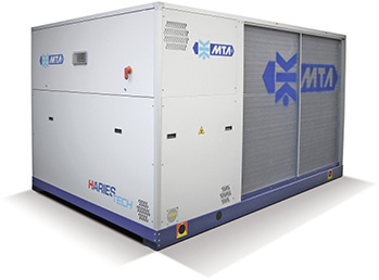Die Kältemaschinen der Serie AriesTech von MTA erfüllen die saisonalen Effizienz-Maßstäbe der Ökodesign-Verordnung (ErP), die 2021 in Kraft tritt (HE-Versionen). Es handelt sich dabei um luftgekühlte Kältemaschinen und Wärmepumpen mit hermetischen Scroll-Verdichtern, Kälteleistungen von 164 bis 365 kW und Wärmeleistungen von 179 bis 374 kW. Die vier hermetischen Scroll-Verdichter in Tandemkonfiguration arbeiten in zwei getrennten Kältekreisen mit R410A als Kältemittel. Die verbauten Plattenverdampfer bestehen aus mit Kupfer gelötetem Edelstahl und die Verflüssigungsseite wird mit zwei Registern realisiert, die lufttechnisch unabhängig voneinander mit jeweils einem der beiden Kältekreise verbunden sind. Die Axialventilatoren sind lufttechnisch getrennt und werden stufenweise geschaltet oder optional als EC-Inverter-Typ stufenlos, entsprechend der Umgebungstemperatur drehzahlgesteuert. www.mta.de