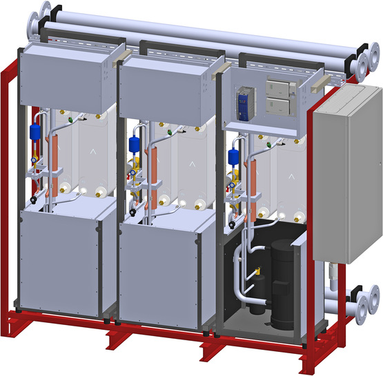 Die Kaskaden-Wärmepumpe WP Max-KK von ratiotherm für den Sole / Wasser- oder Wasser / Wasser-Betrieb erreicht flexibel eine Leistung von bis zu 100 kW. Bei der Verteilung der Kältekreise kann frei zwischen den Leistungsgrößen 15, 25 und 35 kW und einem Modul mit flexibler Invertertechnik gewählt werden. Auch ein nachträglicher Austausch der Kältekreise ist einfach und ohne Kältetechnik-Kenntnisse möglich. Denn sie sind nach dem Schubladensystem montiert und nach dem Plug & Play-Prinzip konzipiert. Die Wärmepumpe ist für hohe (10 bis 55 °C) als auch für niedrige (- 1 bis + 15 °C) Quellnetztemperaturen nutzbar und auch mit Kühlfunktion zu haben. Fernwartung und Module für KNX- und weitere Schnittstellen sind optional möglich. Die Wärmepumpe arbeitet mit dem Kältemittel R 513 A und besteht aus einer Sockelplattform und zwei oder drei voneinander unabhängigen Wärmepumpen in Modulbauweise. Hierbei regelt eine zentrale Steuereinheit das Zusammenspiel der Leistungsstufen, achtet auf eine gleichmäßige Auslastung der Kältekreise und leitet alle internen Vorgänge in der Wärmepumpe. Aufgrund der geringen Kältemittelmengen je Kältekreis ist eine jährliche Dichtheitsprüfung nicht notwendig. Jedes Leistungsmodul besteht aus einem vollständigen Kältekreislauf sowie einer Kondensatorpumpe und einer eigenständigen Steuerung. Es sind Vorlauftemperaturen von bis zu 72 °C möglich.