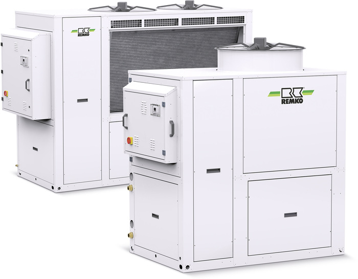 Kaltwassererzeuger KWE Eco von Remko sind mit dem Kältemittel R 452 B ausgestattet und liegen in verschiedenen Ausführungen im Leistungsbereich von 29 bis 315 kW und in drei Schallausführungen vor: Standard, mit Low-Noise-Kit sowie mit Super-Low-Noise-Kit. Das Zubehör reduziert die Schallemissionen um 4 oder 10 dB(A) und ermöglicht die Außenaufstellung auch in sensiblen Bereichen. Sind Pumpe und Speicher bereits bauseits vorhanden, kann das Gerät mit der hydraulischen Grundausstattung eingesetzt werden. Des Weiteren lässt sich der Kaltwassererzeuger mit Pumpen in unterschiedlichen Druckstufen ausrüsten. Ist eine komplette hydraulische Trennung gewünscht, wird das Gerät mit Pumpe, MAG und Speicher ausgestattet. Serienmäßig enthalten die Geräte ein elektronisches Expansionsventil und eine Kurbelwannenheizung, was die Lebensdauer erhöht. Als optionales Zubehör gibt es ein Verflüssiger-Schutzgitter, Schwingungsdämpfer, Sanftanlauf, Manometer für den Medienkreis, eine Winterregelung, eine Schaltschrank-Lüftung und eine Kabelfernbedienung. Über eine Modbus-Schnittstelle lassen sich die Geräte mit der Gebäudeleittechnik verbinden.