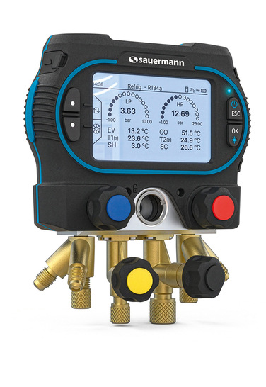 Sauermann stellt mit den Modellen Si-RM350 und Si-RM450 digitale Manifolds für den Einsatz an Wärmepumpen, Klimaanlagen sowie Kühl- und Umkehrsystemen in der Haustechnik und Industrie vor. Die Geräte sind für den Umgang mit den Kältemittelklassen A1, A2L und A3 geeignet und verfügen über ein Antireflex-Displayglas. Zum System gehören kabelgebundene und kabellose Sonden zur Messung von Temperatur, Druck, Vakuum und psychrometrischen Parametern, wobei die Funkverbindung bis zu 100 m reicht. Die Temperatursonden nutzen papageienschnabelförmige Klemmen für Rohrdurchmesser von 6 bis 42 mm. Ergänzt wird das System durch Peripheriegeräte wie eine vernetzte Lastwaage und Vakuumpumpen. Die Anbindung erfolgt über die App Sauermann Pilot für Android und iOS. Diese zeigt Messungen in Echtzeit an, ermöglicht die Fernsteuerung der Geräte, zeichnet Messreihen zur Analyse auf, verwaltet Kundendaten und erstellt Berichte. Eine integrierte Diagnosefunktion unterstützt bei der Fehlerbehebung, und die Geräte sind für die Datenprotokollierung über längere Zeiträume ausgelegt.