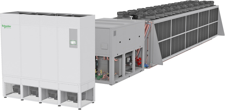 Schneider Electric erweitert seine Kühllösungen für Rechenzentren um die Kaltwassersätze aus der DSAF-Serie von Uniflair in Baugrößen von 400 bis 1 250 kW, die alle mit sechs Scroll-Kompressoren ausgestattet sind. Alle Geräte sind auf hohe Freikühlleistungen ausgerichtet. In Verbindung mit den für erweiterte luft- und wasserseitige Temperaturarbeitsbereiche ausgelegten HXCV-Innengeräten ergibt sich ein aufeinander abgestimmtes, energiesparendes Gesamtkühlsystem. Möglich sind die drei Betriebsarten freie Kühlung, Mixed-Mode und mechanische Kälte. Alle Betriebsmodi können optional auch mit adiabatischer Kühlung ergänzt werden. Die verkürzte Laufzeit der mechanischen Kühlung macht den Einsatz kleinerer Kompressoren möglich. Wegen des modularen Aufbaus unterstützt das Kältesystem eine schnelle Bereitstellung und macht bei wachsendem Klimatisierungsbedarf eine schnelle Skalierbarkeit möglich. Eine einfache und zuverlässige Fernüberwachung ist realisierbar.