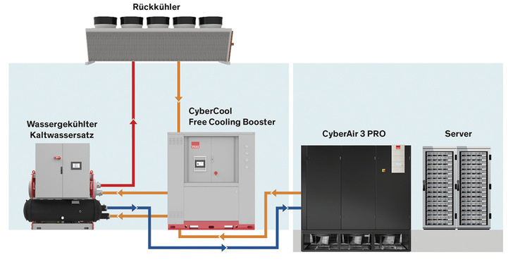 Mit Hilfe des CyberCool Free Cooling Boosters lassen sich KWS-Innengeräte, die bisher nicht die technischen Voraussetzungen für eine Nutzung der Freien Kühlung erfüllen, mit einer energiesparenden Freikühlfunktion nachrüsten. Dank Plug-&-Play-Prinzip mit hohem Vorfertigungsgrad kann das Modul ohne hohen Bau- und Installationsaufwand in fast alle herkömmlichen Kaltwassersysteme integriert werden. Das Freikühlsystem bietet eine geprüfte und ab Werk getestete Hydraulik, aufeinander abgestimmte Kältekomponenten und eine intelligente Regelung und ist in fünf Baugrößen mit Kühlleistungen zwischen 270 und 1800 kW erhältlich. Die integrierte Schaltschranklösung mit patentierten SEC.blue-Controllern stellt eine optimale Regelung sowie eine einwandfreie Kommunikation mit Kaltwassersätzen und Rückkühlern sicher. Die Steuerung überwacht sowohl die Außen- als auch die Betriebstemperatur und regelt so die Kühlleistung des Rückkühlers jeweils nach aktuellem Bedarf. Das System unterstützt dabei drei Betriebsmodi: Freie Kühlung, Mix-Betrieb und mechanische Kühlung. In Abhängigkeit von der Außentemperatur wählt das System automatisch den jeweils günstigsten Modus, um einen effizienten Ganzjahresbetrieb sicherzustellen. Die Steuerung der Kondensationstemperatur und ein maximaler Freikühlanteil sind somit auch bei höheren Außentemperaturen gewährleistet.