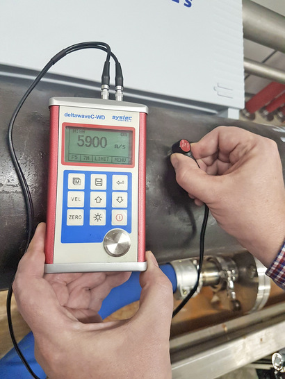 vorgesehen, das auf Ultraschallbasis arbeitet. Es misst zerstörungsfrei und kontaminationsfrei, ohne dass das Rohr beschädigt oder der Prozess unterbrochen werden muss. Das Gerät ist an fast allen herkömmlichen Materialien – Kunststoff, Kupfer oder Stahl – einsetzbar und nutzt das Ultraschall-Laufzeitverfahren.