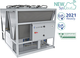 Die luftgekühlten Kaltwassersätze SysAqua von Systemair gemäß ErP 2021 gibt es in unterschiedlichen Versionen: Neben der Version SysAquaL (nur Kühlen) erlaubt die Wärmepumpenausführung SysAquaH ein Umschalten auf die Heizfunktion. Alle Versionen sind in fünf Baugrößen verfügbar und decken eine Nennkühlleistung von 134 bis 209 kW sowie eine Nennheizleistung von 143 bis 217 kW ab. Sie sind Eurovent-zertifiziert und mit vier Scroll-Verdichtern ausgestattet. Diese sind in eine Schallschutz-Box eingebaut, was eine hohe Laufruhe bewirkt. Der Verflüssiger ist für optimale Leistung und Abtauzyklen groß dimensioniert. Es ist eine konstante Wasseraustrittstemperatur bei geringer Außenlufttemperatur möglich. Eine spezielle Enteisungslogikschaltung verhindert die gleichzeitige Enteisung von beiden Kältekreisläufen. Per Cloud-Verbindung ist der Schnellzugriff auf alle Daten sowie die zeit- und ortsunabhängige Steuerung des Kaltwassersatzes möglich. Zum Zubehörspektrum zählen Pufferspeicher sowie ein Hydraulikkit mit einer oder zwei redundanten Pumpen unterschiedlicher Förderleistung.