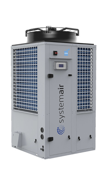 Der Kaltwassersatz Sysaqua Blue bietet mit dem natürlichen Kältemittel R 290 einen niedrigen GWP von 3. Das System erzielt dabei z. B. einen SCOP von bis zu 3,54 sowie einen SEER von 4,33. Die Wärmepumpe ist mit einer Kälteleistung von 31,7 kW und einer Heizleistung von 35,4 kW bei einer Leistungsaufnahme von 10,2 kW verfügbar. Durch die Kombination von bis zu sechs Einheiten kann diese Leistung auf bis zu 210 kW erhöht werden. Sobald Propan von der Leckageerkennung erkannt wird, stoppt das Gerät den Betrieb. Darüber hinaus sorgt ein in sich geschlossenes Belüftungssystem für die Entlüftung des kältetechnischen Abteils. Dazu kommt eine tägliche automatische Überprüfung des Belüftungssystems. Eine optionale Fernsteuerung und Überwachung mittels AC Cloud-Lösung sind ebenfalls erhältlich.