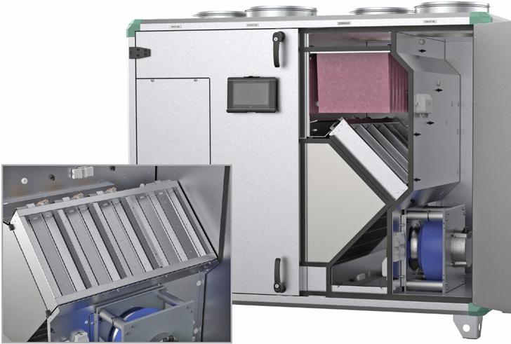 Der Wärmeübertrager eines Lüftungsgeräts kann bei Außentemperaturen unter dem Gefrierpunkt vereisen. Mit steigender Vereisung wird der Energieverbrauch erhöht und die Effizienz der Wärmerückgewinnung sinkt. Die Enteisungsfunktion von Systemair löst dieses Problem, verfügbar für die Lüftungsgeräte der Reihen Topvex TX / C, SX / C und Geniox. Die sektionale Enteisung, bestehend aus mehreren Klappen, die den Gegenstrom-Wärmeübertrager in mehrere Bereiche und zusätzlich den Bypass-Bereich aufteilen, wird mittels Drucküberwachung aktiviert. Die sektionalen Klappen werden hierbei zyklisch angesteuert. Im Winterbetrieb wird so die Vereisung des Wärmeübertragers verhindert. Bis − 20 °C kann auf ein energieintensives Vorheizregister verzichtet werden, außerdem kann das Nachheizregister kleiner dimensioniert werden. Wegen der sektionalen Enteisung wird die Effizienz der Wärmerückgewinnung auch bei Temperaturen unter null Grad Celsius sichergestellt und das bei gleichzeitig geringem SFP-Wert. Ein weiteres Merkmal ist ein höherer Wirkungsgrad aufgrund von Energieersparnis während des Enteisungsbetriebs.