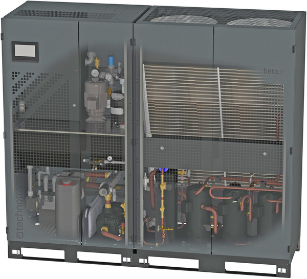 Technotrans hat mit den alpha.c und beta.c (Bild) seine Kombinationsgeräte zur Feuchtmittel-Aufbereitung und Farbwerk-Temperierung überarbeitet. Wegen der speziellen Verfahrenstechnik wird nun eine verbesserte Energieeffizienz erreicht. Zudem wurde auf das A 1-Sicherheitskältemittel R513A mit niedrigem GWP umgestellt. Im beta.c arbeiten zwei getrennte Kältekreise für das Feuchtmittel und die Farbwerk-Temperierung, sodass beide Kreise direkt gekühlt werden. Zudem kann eine interne Kühlkreispumpe entfallen. Dies führt zu Energieeinsparungen von teilweise über 20 Prozent. Darüber hinaus kommt bei den luftgekühlten beta.c-Kondensatoren Mini-Channel-Technik zum Einsatz: Durch kleinere Rohrquerschnitte benötigen die Kreisläufe weniger Kältemittel. Schließlich wurden zahlreiche Detailverbesserungen hinsichtlich Verfügbarkeit, Bedienbarkeit und Servicezugänglichkeit vorgenommen.