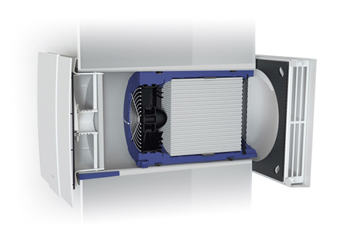 Das Einzelraumlüftungsgerät B44 von Vallox kann wahlweise mit einem Außengitter oder mit einem Fensterlaibungsmodul in die Außenwandkonstruktion integriert werden. Das Gerät eignet sich mit einer Luftleistung von 45 m 3 /h für einzelne Räume sowie für kleine Wohnungen oder Appartements. Es lässt sich einfach warten und erreicht einen hohen Hygienegrad. Der Einzelraumlüfter wechselt intermittierend zwischen Zu- und Abluftbetrieb. Der Keramikwärmespeicher erzielt einen Wärmebereitstellungsgrad von 88 Prozent. Eine designbetonte, manuell verschließbare Innenblende verleiht dem Gerät zum Raum hin eine dezente Optik. Nimmt man diese ab, können alle Bauteile gut erreicht und gereinigt werden. Auch der Wärmeübertrager lässt sich durch eine Auszugshilfe leicht herausnehmen. Beim Einbau in die Außenwand schließt die Wandhülse nach außen mit einer optisch unauffälligen Metall-Außenblende ab. Für den Einbau neben einem Fenster kann anstelle des Rohbausets ein Fensterlaibungsmodul eingesetzt werden. Das Wandelement besteht aus einem rechteckigen EPP-Dämmblock. Eine Kondensatabführung verhindert das Eindringen von Feuchtigkeit in die Dämmebene. www.vallox.de