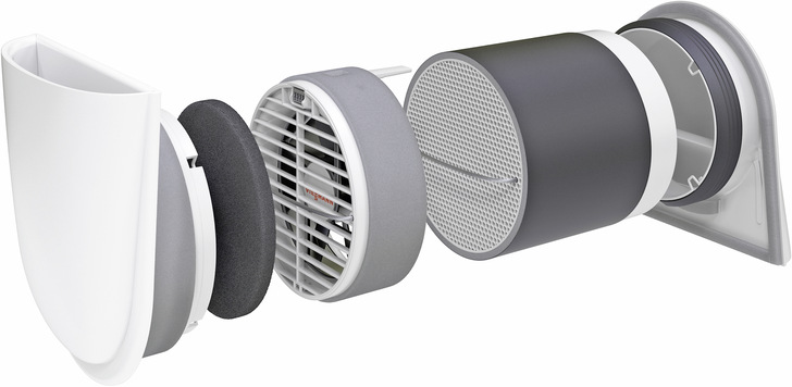Als dezentrale Lösung ohne Lüftungskanäle kommt die Wohnungslüftung Vitovent 100-D (Luftvolumenstrom bis 45 m3/h, Energieeffizienzklasse A oder A+) von Viessmann, die sich per App mit dem Smartphone bedienen lässt. Be- und entlüftet werden können Einzelräume, Teile einer Wohnung (Lüftungszonen) oder die ganze Wohnung nahezu ohne Wärmeverluste. Dazu gewinnt die integrierte Wärmerückgewinnung bis zu 91 Prozent der Wärme aus der Abluft zurück und überträgt sie auf die frische Zuluft. An heißen Sommertagen lässt sich die Wärmerückgewinnung deaktivieren. Während der Nacht wird dann den Räumen gezielt kühle Luft zugeführt. Neben einem zentralen Bedienelement mit Touch-Display lässt sich das Lüftungssystem über die App steuern, optional auch per Spracheingabe, Amazon Alexa und Google Assistant. Für bis zu drei Lüftungszonen im Haus oder in der Wohnung können Sollwerte für Luftfeuchtigkeit und Temperatur sowie Zeitprogramme festgelegt werden. Informationen über den Gerätestatus, so über notwendige Filterwechsel, werden ebenfalls angezeigt. Der Luftdurchlass wird nahezu unsichtbar in die Fensterlaibung integriert und dämmt wirksam den Schall. Zusätzlich zu den Abluftventilatoren für außenliegende Räume gibt es nun auch einen Abluftventilator E300 für innenliegende Räume, der in Verbindung mit einem Feuchtesensor auch vollautomatisch arbeiten kann.