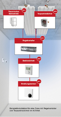 Die neue Regelungstechnik von Zehnder ist zum kontrollierten Heizen sowie zum Kühlen einsetzbar. Über einen Sensor werden dabei Strahlungs- und Raumlufttemperatur er-fasst. Die Sollwerte können über die Bedieneinheit mit einer LCD-Anzeige und einem Drehknopf angepasst werden. Zudem enthält sie ein verbessertes Zeitprogramm für Komfortregelung und Energieeinsparung. Um die gewünschte Empfindungstemperatur in der jeweiligen Zone zu gewährleisten, bildet der Strahlungssensor einen Mittelwert aus Lufttemperatur und mittlerer Strahlungstemperatur. Dieser Wert wird an die Bedieneinheit übermittelt. Sobald die eingestellte Temperatur über- oder unterschritten wird, meldet die Bedieneinheit diese Information an den thermischen Stellantrieb. Der an den Stellantrieb gekoppelte Volumenstromregler passt den Massenstrom durch die Deckenstrahlplatte entsprechend an. Wenn in größeren Räumen unterschiedliche Temperaturen gewünscht sind, wird für jede Zone eine separate Bedieneinheit benötigt, an die bis zu fünf Stellantriebe angeschlossen werden. www.zehnder-systems.de